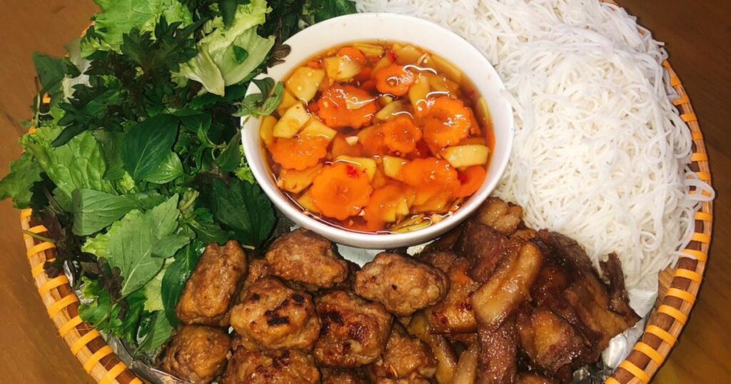 Bún Chả consists of two main components: tender grilled pork and thin rice vermicelli noodles. The pork is prepared in two forms: juicy pork patties and thinly sliced, marinated pork belly, and then grilled over charcoal for a smoky aroma. These are paired with a bowl of dipping sauce made from fish sauce, vinegar, garlic, chili, and sugar, often accompanied by pickled green papaya and carrot.